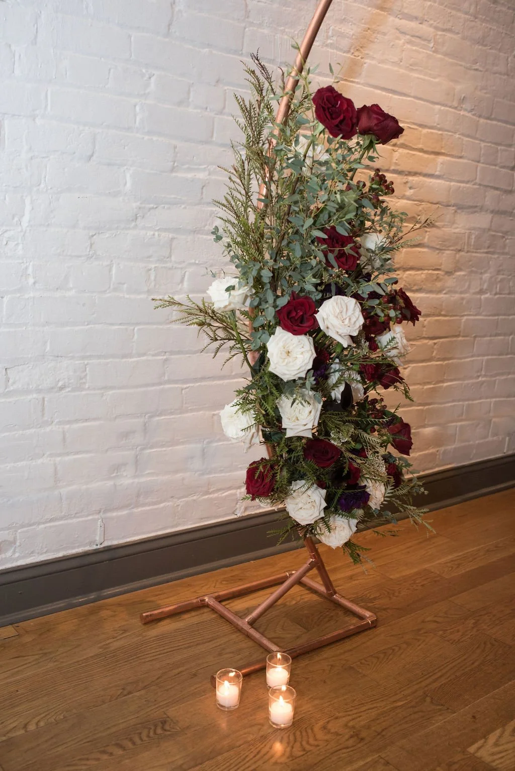 Savanah had a vision, and we made sure to listen as we brought that vision to life! One of our past instagram posts caught her eye featuring a moody red floral piece crafted by Poppy Belle Floral Design located in Durham NC. We took inspiration from this and designed something new specifically for her in the color pallet she desired.